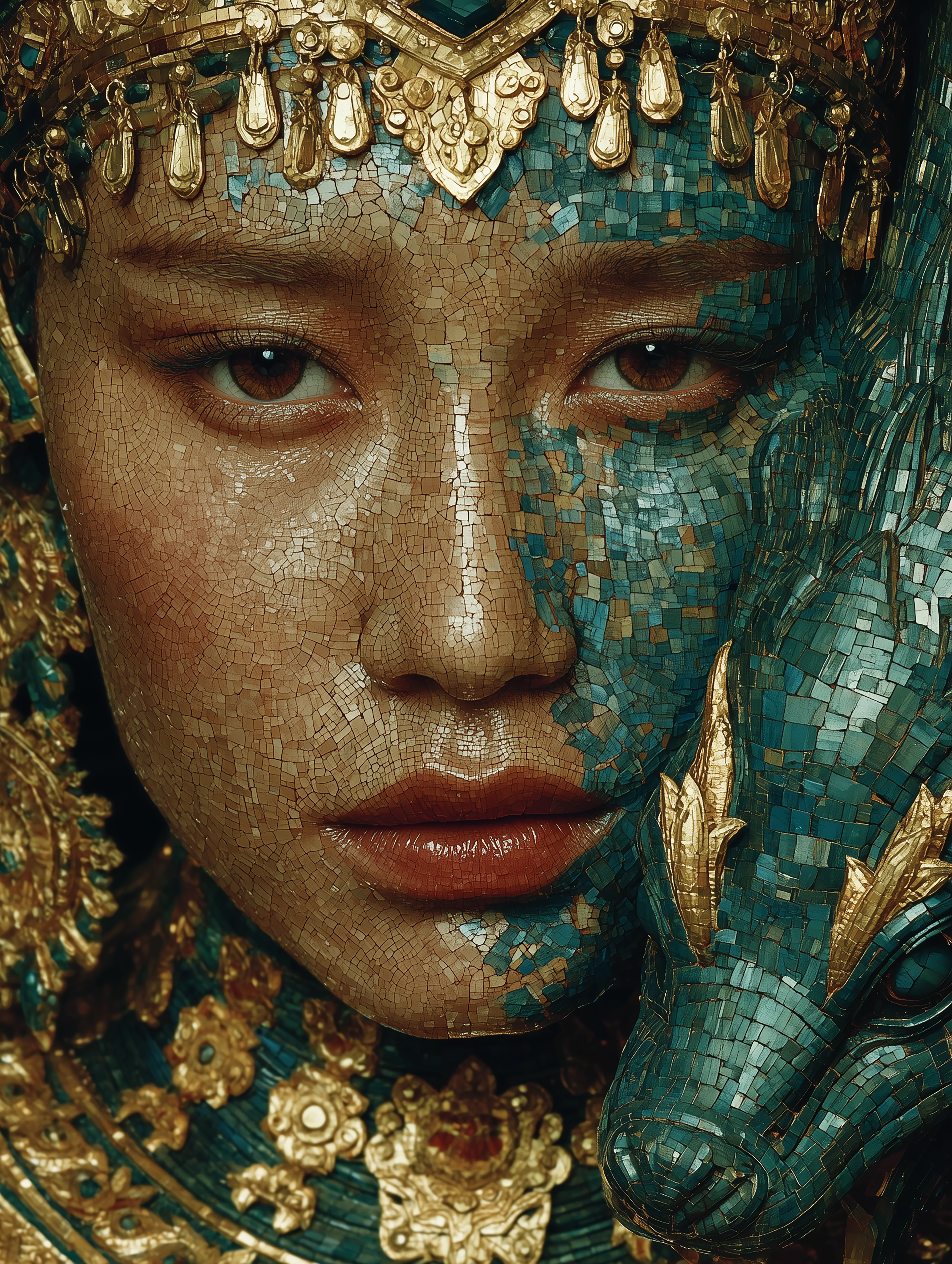 This artwork embodies that moment of awakening and despair — the instant she realizes she is returning to her former form. The mosaic texture upon her face and body is not merely ornamentation; it represents the sacred scales resurfacing, each shard reflecting a fragment of her struggle, faith, and sorrow.