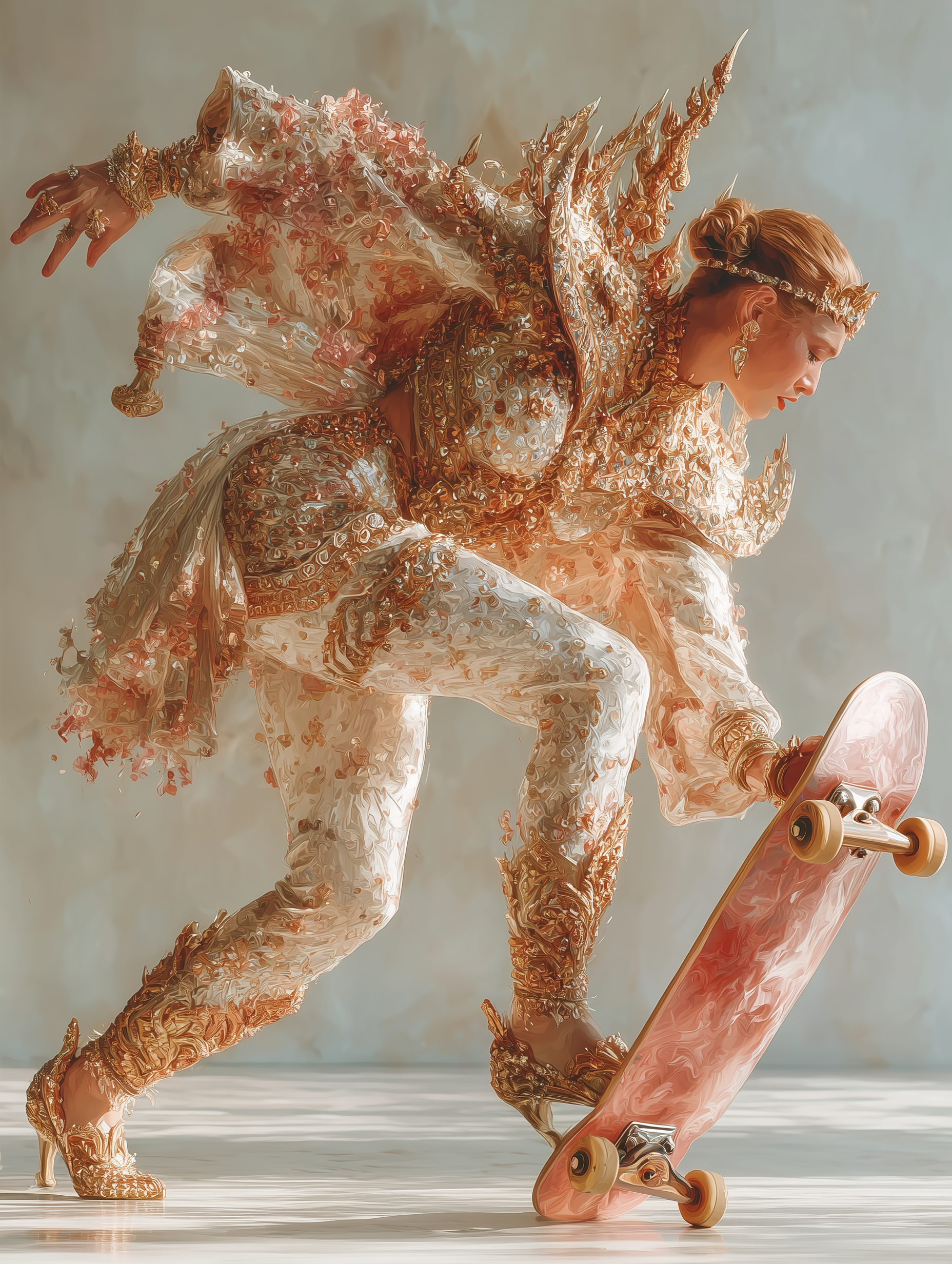 I created images of Thai-inspired figures taking photos, using a tablet, DJ-ing, boxing, skateboarding, and more — because why can’t tradition be fun, stylish, and contemporary too?
