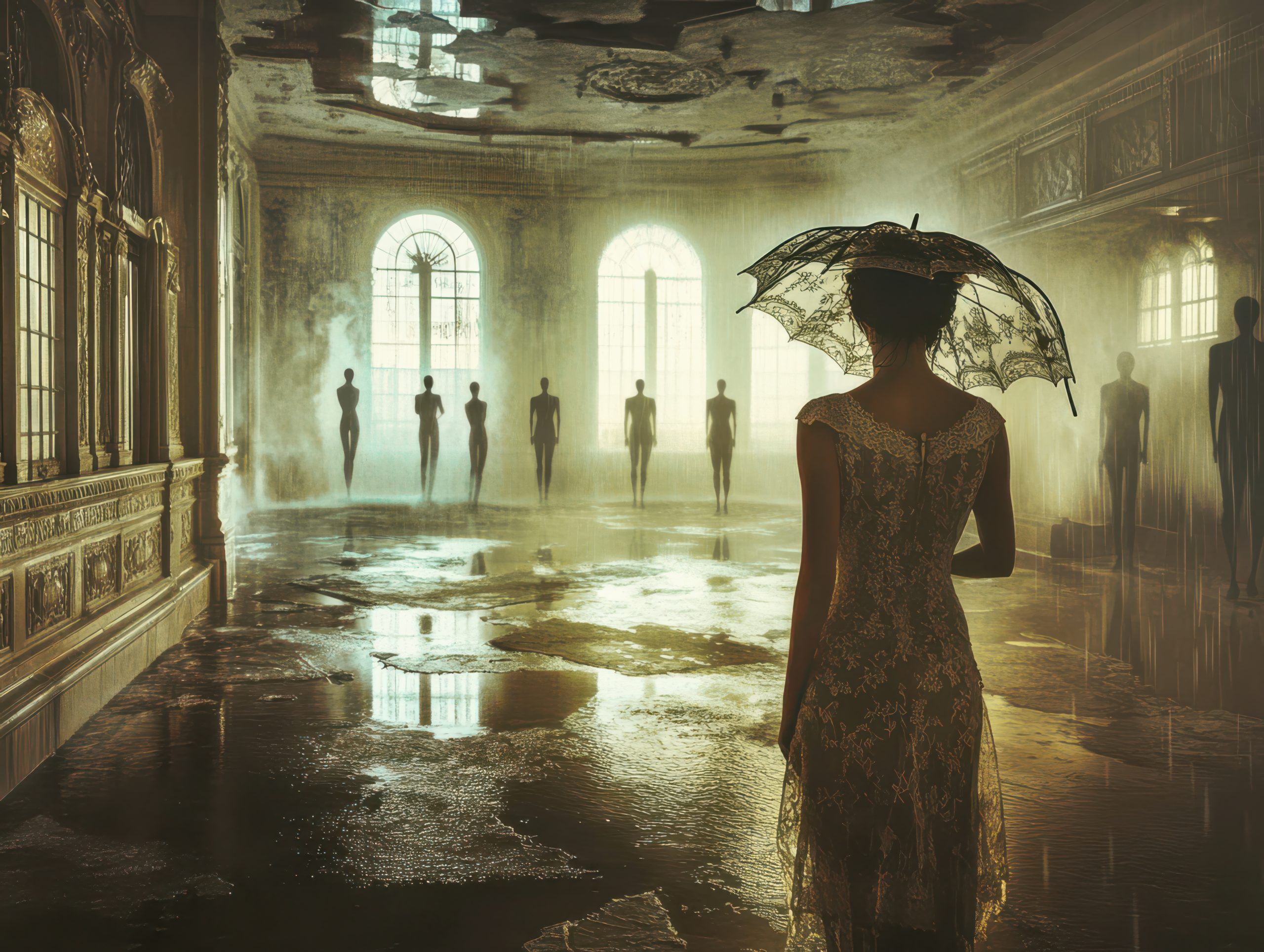 She stepped into the ruins of yesterday, where shadows remembered how to dance. Lace clung to her like memory, delicate and unyielding, as the rain painted stories on the marble floor. They watched—still, silent—ghosts of the past, or perhaps reflections of who she used to be. In this drowning grandeur, she didn’t seek escape. She sought meaning.