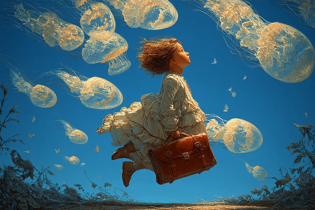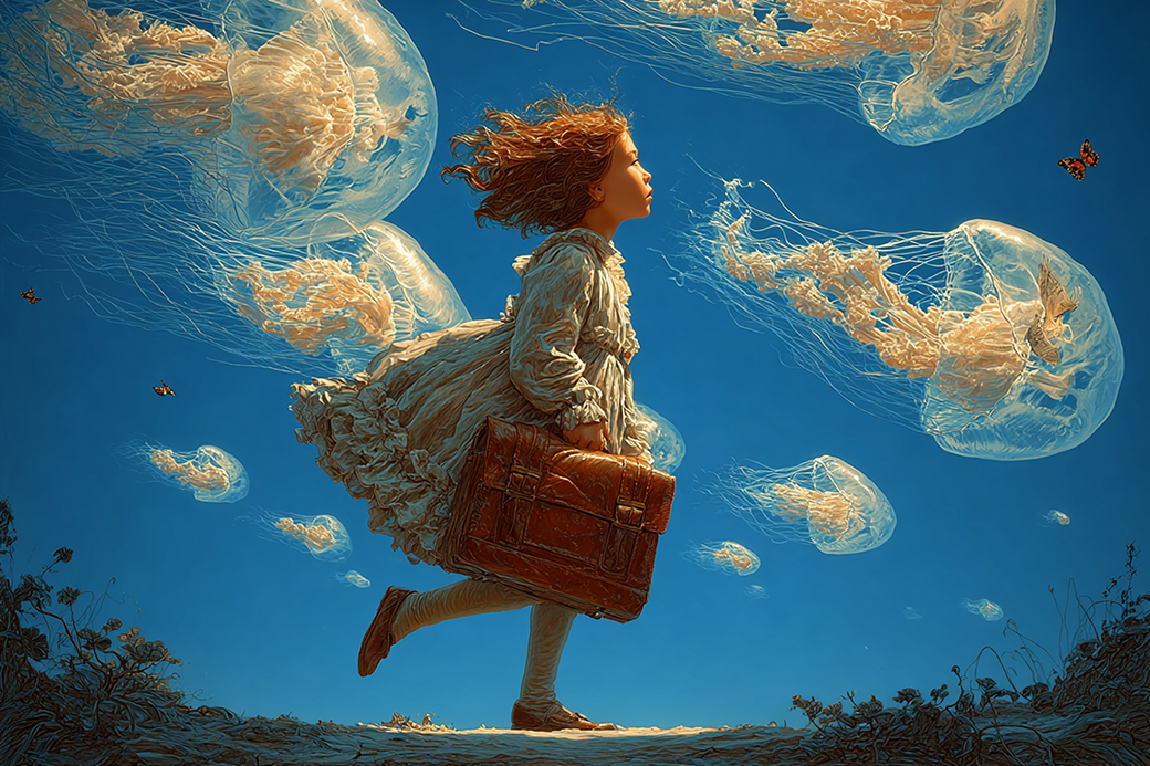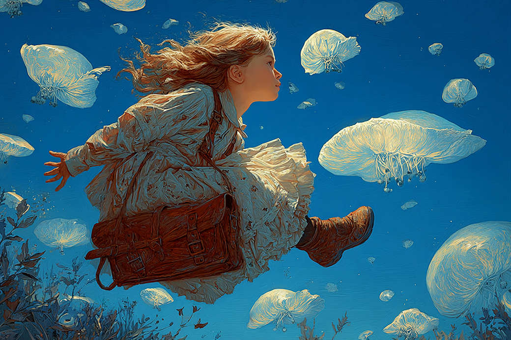 I really identify with this girl! She set off walking to school one windy spring morning, then noticed that the wind was blowing jellyfish through the sky past her. Ever ready for an adventure, she jumped up and joined them. Who knows where this journey of her imagination will take her? I made the video and the still pictures from which it started on Midjourney.